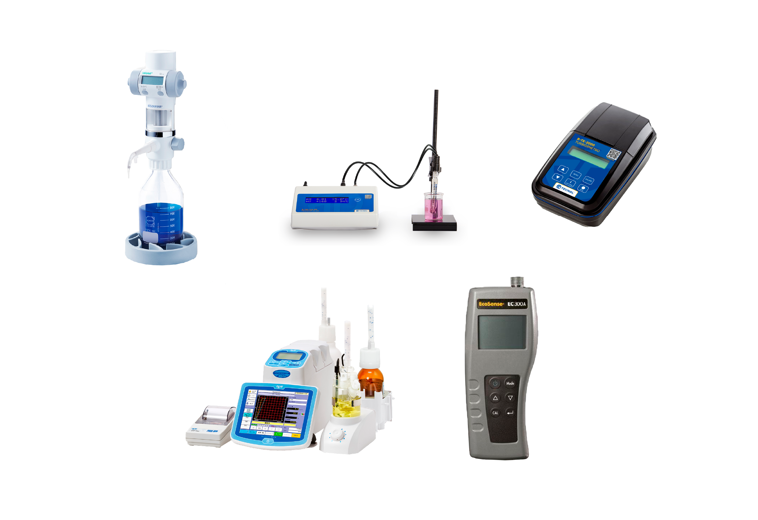 Para essas análises, podem ser utilizas as buretas digitais portáteis ou tituladores automáticos, medidores de pH de bancada, turbidimetro e medidor de condutividade.